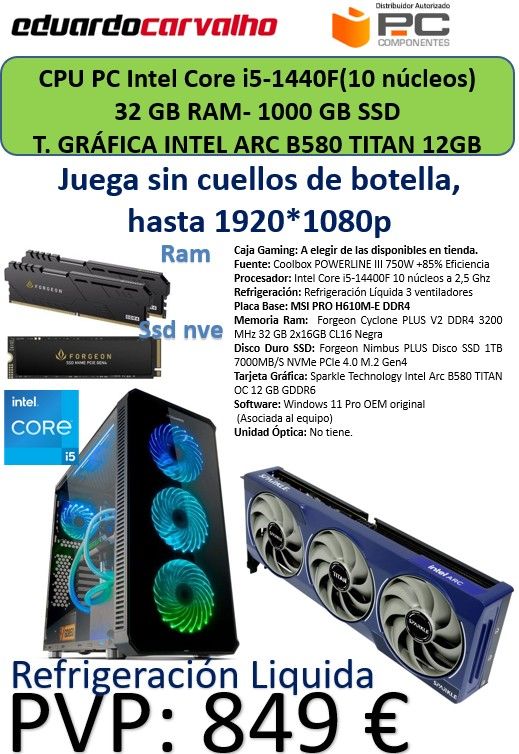 Equipo Listo para trabajar.Recogida en tienda fisica o envío en 48 horas a península.Todas las cajas de los productos se entregan.La licencia de Windows 11 es OEM, solo clave, se envia en la factura.Caja Gaming: A elegir de las disponibles en tienda.Fuente: Coolbox POWERLINE III 750W +85% EficienciaProcesador: Intel Core i5-14400F 10 núcleos a 2,5 GhzRefrigeración: Refrigeración Líquida 3 ventiladoresPlaca Base: MSI PRO H610M-E DDR4 Memoria Ram: Forgeon Cyclone PLUS V2 DDR4 3200 MHz 32 GB 2x16GB CL16 NegraDisco Duro SSD: Forgeon Nimbus PLUS Disco SSD 1TB 7000MB/S NVMe PCIe 4.0 M.2 Gen4Tarjeta Gráfica: Sparkle Technology Intel Arc B580 TITAN OC 12 GB GDDR6Software: Windows 11 Pro OEM original (Asociada al equipo)Unidad Óptica: No tiene.